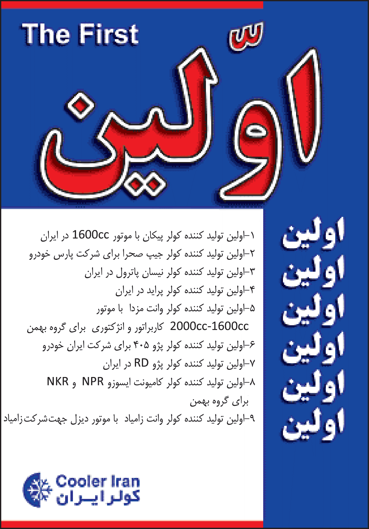نام كولر ايران در سراسر كشور معرف شركتي توانا با تنوع محصولات در زمينه تامین سيستم كولر برای انواع اتومبيل ميباشد. شرکت اتوبوسرانی اتوتوکل كه در سال 1319 هجري شمسي توسط آقاي علي اكبر توسل باقري تأسيس گرديد، در طی 70 سال فعالیت اقتصادی با تحولات و جهت گیری صورت گرفته، امروزه به يكي از پيشگامان در صنعت كولر اتومبيل در كشور مبدل گشته است. تصوير زير برخي از نكات برجسته فعاليتهاي كولر ايران را در طی ده سال اخير ارائه مینماید
